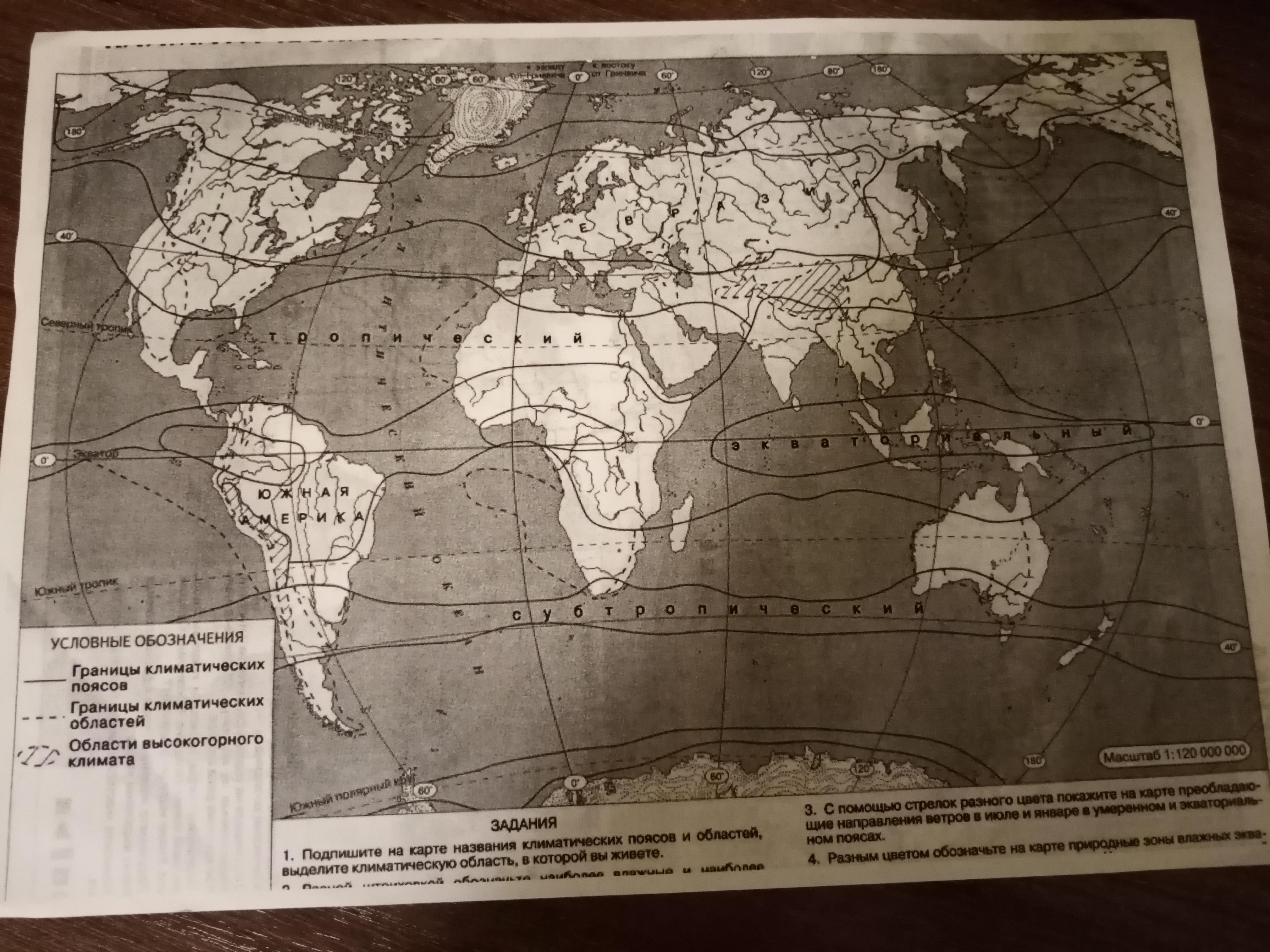 1) подпишите на карте название климатических поясов и областей.