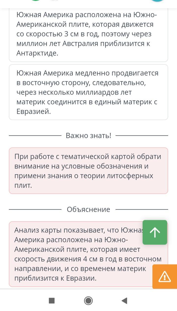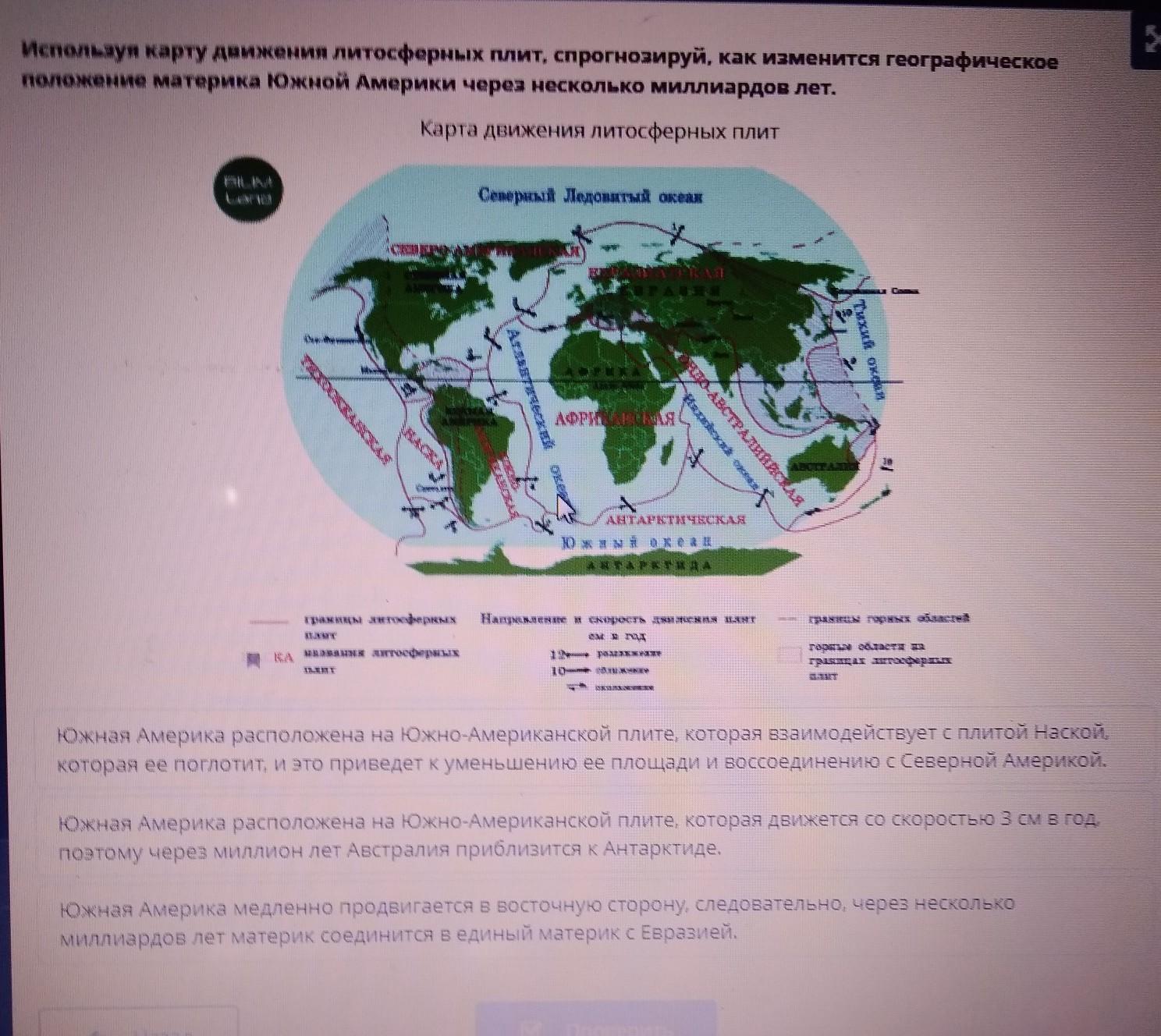 Используя карту движения литосферных плит, спрогнозируй, как изменится географическое положение материка Южной Америки через несколько миллиардов лет.