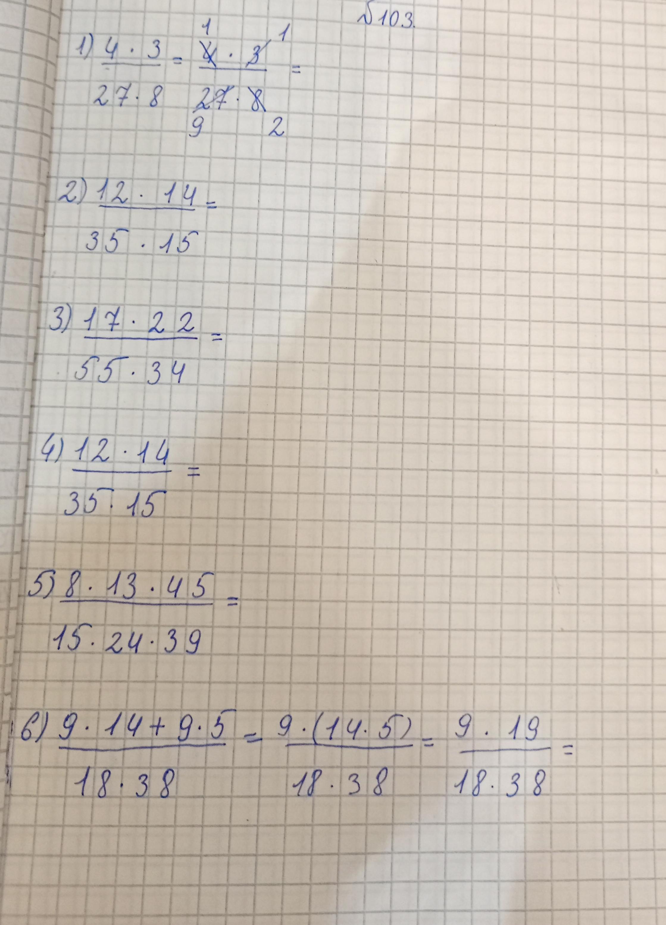 в шестом вы верно начали. выносим девятку за скобки и выходит в числителе 9(14+5), в знаменателе так же. и в итоге в числителе остаётся 9×19. 18 и 9 сокращаем на 9. остаётся 2 и 1. 19 и 38 на 19. остаётся 1 и 2. остаётся в итоге 1/4 или 0.25