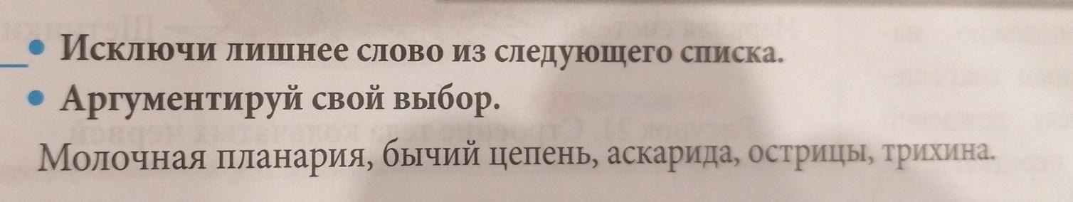 Исключи лишнее слово из следующего списка. Аргументируй свой выбор. Молочная планария, бычий цепень, аскарида, острицы, трихина.