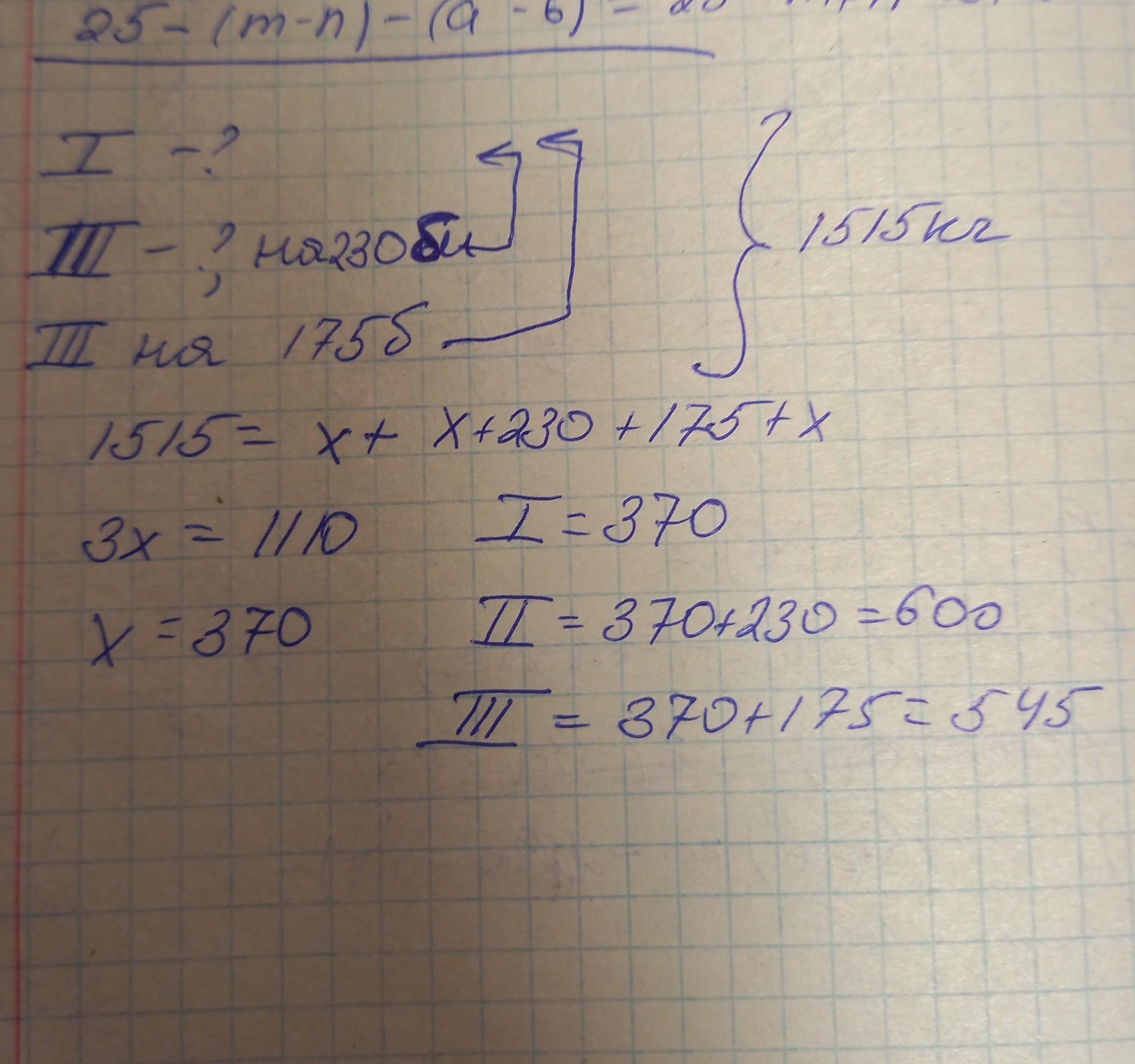 Составить и решить уравнение к задаче: В первый день собрали на 230 кг яблок меньше, чем во второй, а в третий на 175 кг больше, чем в первый день. Сколько яблок было собрано в каждый день, если за три дня собрали 1515кг?