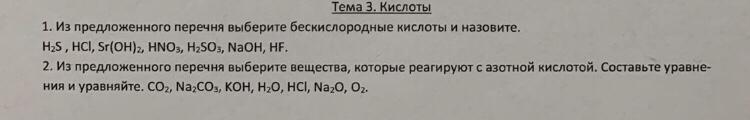 1. Бескислородные кислоты: H²S (сероводородная), HCl (хлороводородная или соляная), HF (фтороводородная)