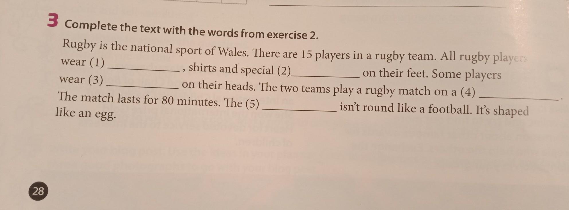 3 complete the text with the words from exercise 2. Rugby is the national sport of Wales. There are 15 players in a rugby team. All rugby players wear (1) shirts and special (2) on their feet. Some players wear (3) on their heads. The two teams play a rugby match on a (4) The match lasts for 80 minutes. The (5) isn't round like a football. It's shaped like an egg. помагите