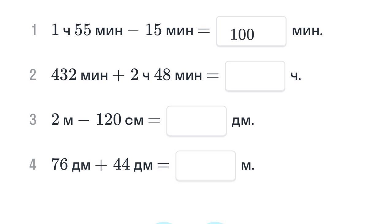 3) 2м - 120см = 20дм - 12дм = 8дм.