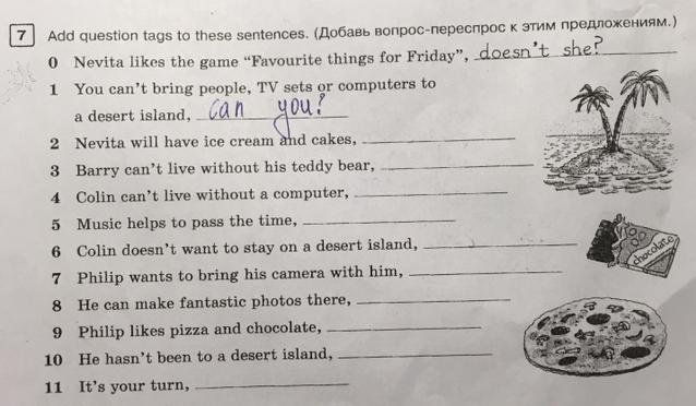2. Novita will have cream and cakes, won't she? 3 Barry can't live without his teddy bear, can he? 4 Colin can't live without a computer, can she? 5 Music helps to pass the time, doesn't it? 6 Colin doesn't want to stay on a desert island, does she? 7 Philip wants to bring his camera with him, doesn't he? 8 He can make fantastic photos there, can't he? 9 Philip likes pizza and chocolate, doesn't he? 10 He hasn't been to a desert island, has he?