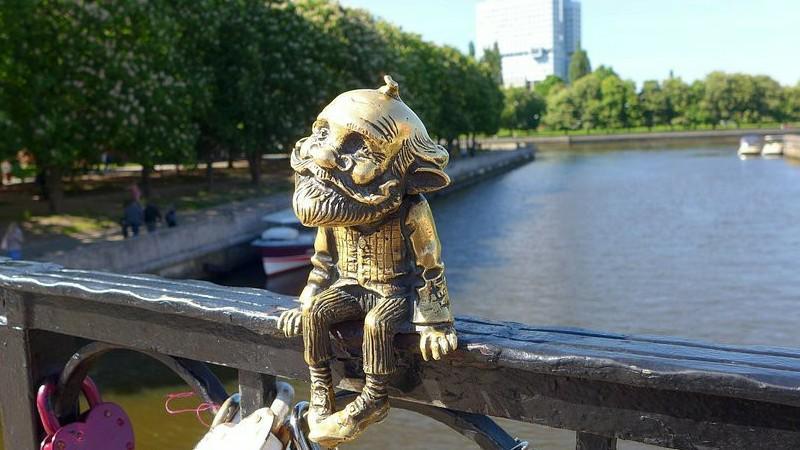 крохотная бронзовая фигурка доброго старичка на левом железном парапете Медового моста,с острова Иммануила Канта в Рыбной деревне. По существующей легенде - Хомлины, это мифологические домовые, которые жили с людьми много лет рядом и создавали изделия из янтаря. На сегодняшнее время в Калининграде их 7. Примерно где-то 30-45 см в высоту