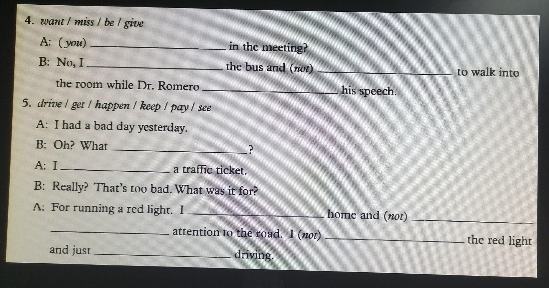 B: No, I missed the bus and didn’t want to walk into the room while Dr. Romero gave his speech.
