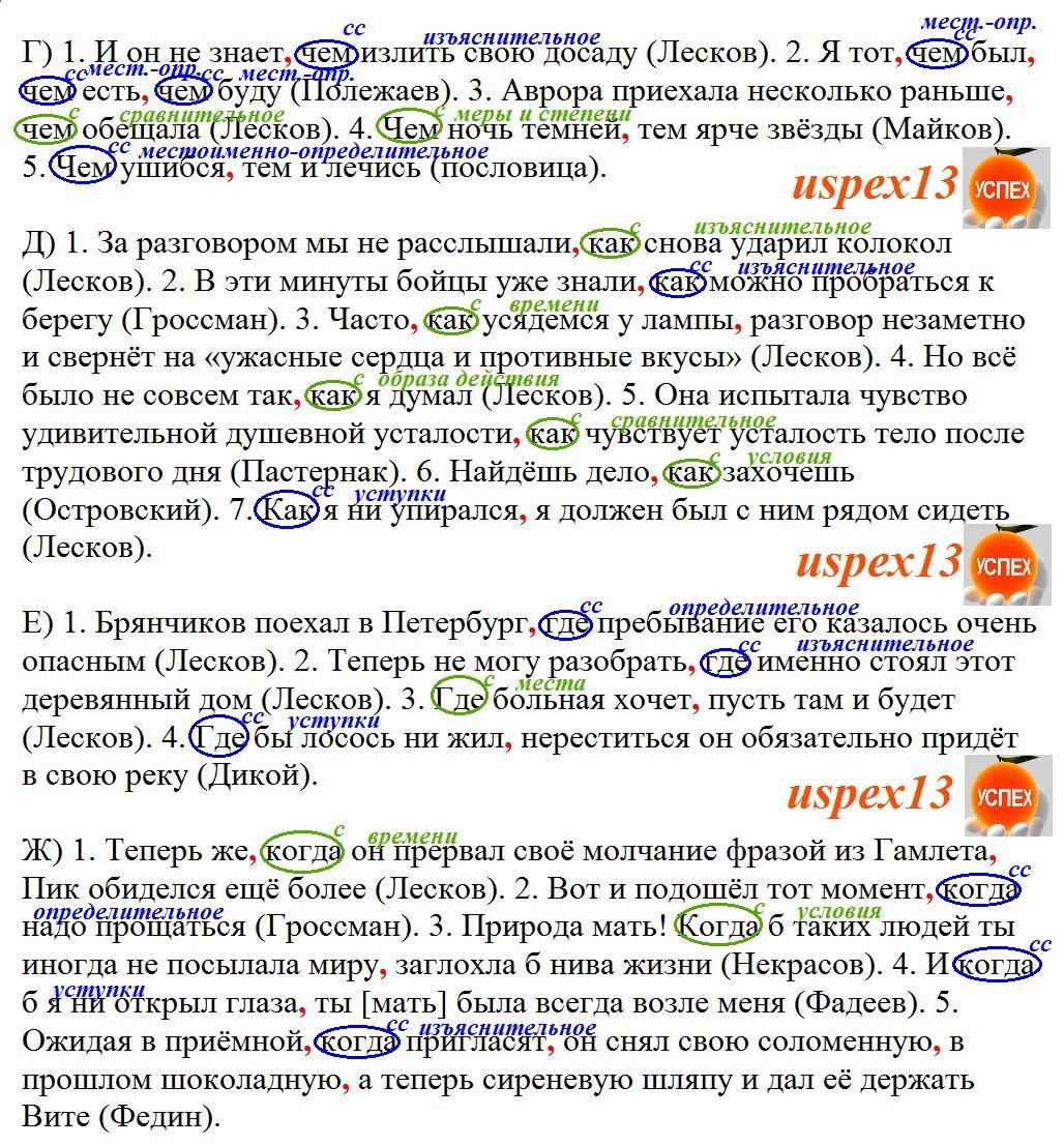 Д) 1. За разговором мы не расслышали как снова ударил колокол (Лесков). 2. В эти минуты бойцы уже знали как можно пробраться к берегу (Гроссман). 3. Часто как усядемся у лампы разговор незаметно и свернёт на «ужасные сердца и противные вкусы» (Лесков). 4. Но всё было не совсем так как я думал (Лесков). 5. Она испытала чувство удивительной душевной усталости как чувствует усталость тело после трудового дня (Пастернак). 6. Найдёшь дело как захочешь (Островский). 7. Как я ни упирался я должен был с ним рядом сидеть (Лесков).