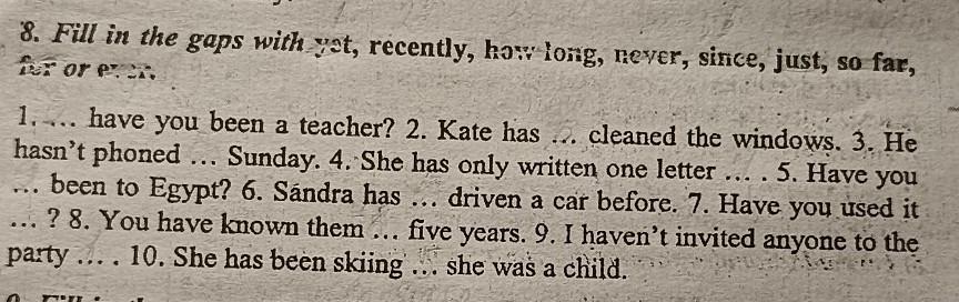 8. Fill in the gaps with yet, resently, how long, never, since, just, so far, for or ever.