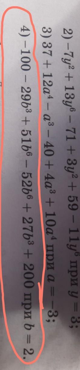 Найдите значения многочленов 4) -100 - 29b³ + 51b⁶ - 52b⁶ + 27b³ + 200 при b = 2;