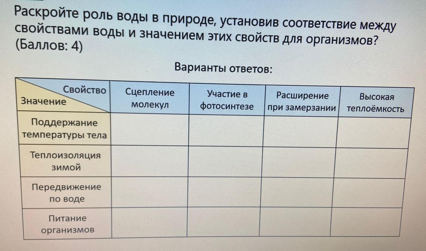Раскройте роль воды в природе установив соответствие между свойствами воды и значением этих свойств для организма.