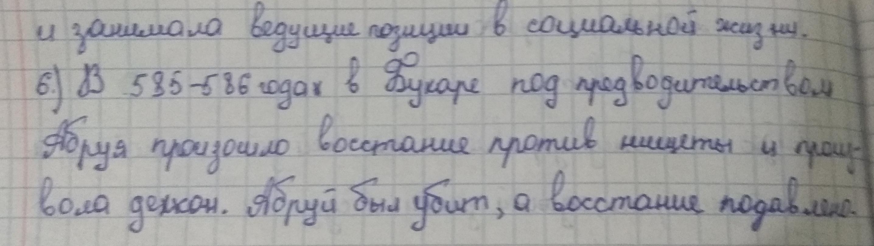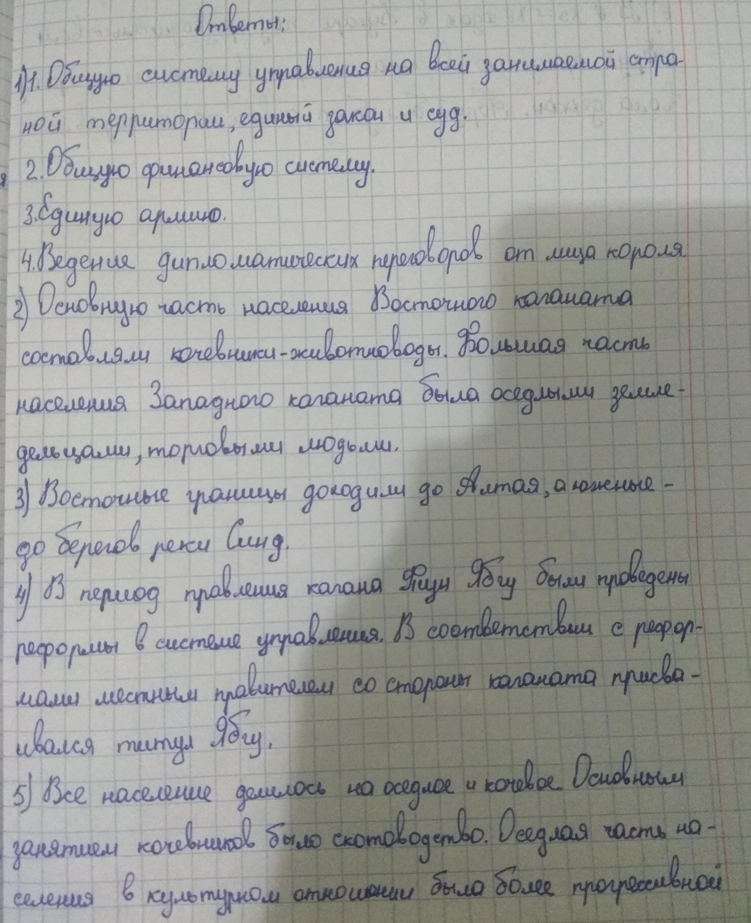 1. Каковы основные признаки сильного централизованного государства? 2. В чем сходство и отличия Западного и Восточного каганатов? 3. Какие территории относились к Западному тюркскому каганату? 4. В какой сфере проводились реформы в эпоху правления Туна Ябгу? 5. Почему различными были жизнь и деятельность населения Тюркского каганата? 6. В связи с чем в Бухаре началось народное восстание? И чем оно закончилось?