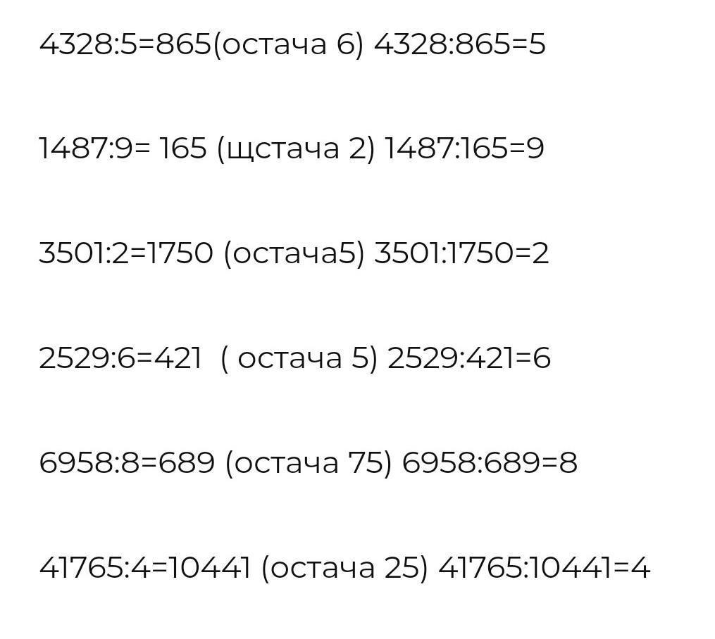Выполни деление с остатком и сделай проверку 4 328 ÷ 5 1487 ÷ 9 3 501 ÷ 2 две 529 ÷ 6 6 958 ÷ 8 41 655 ÷ 4