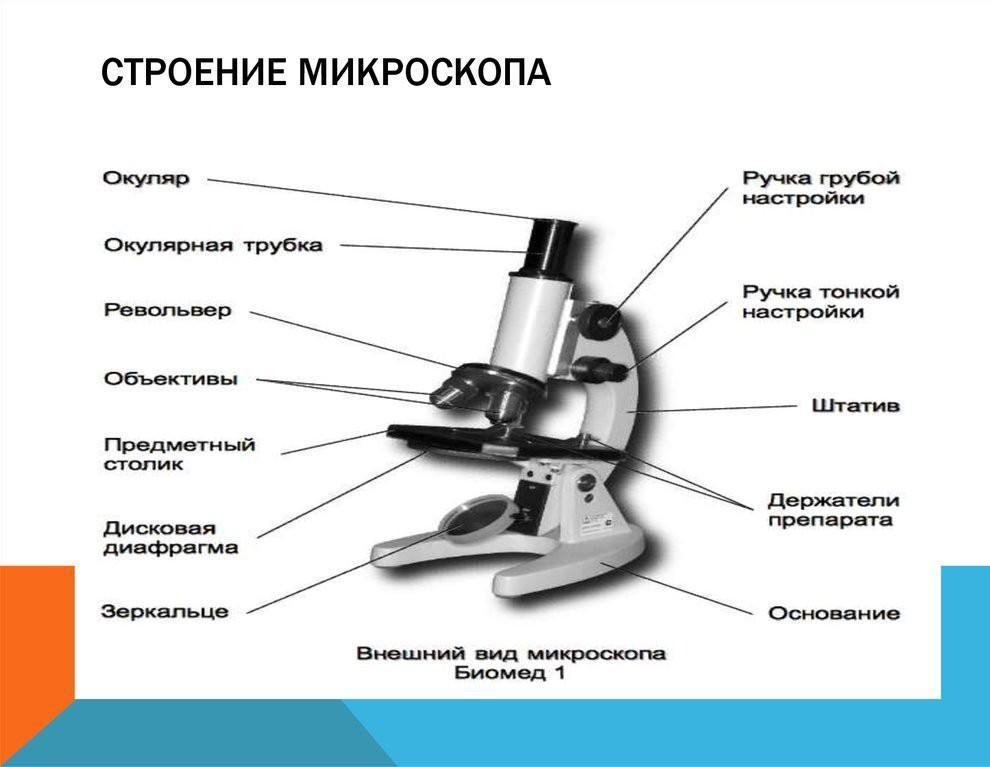 Какое строение у микроскопа? Обозначьте части микроскопа? И расскажите для чего каждая часть????