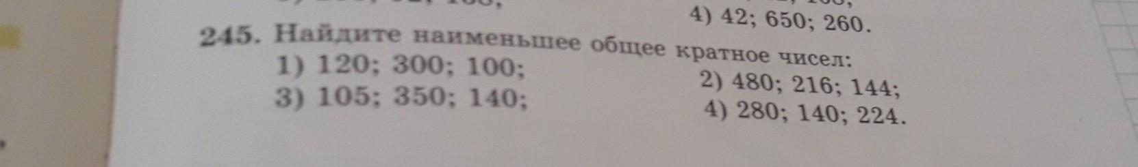 245. Найдите наименьшее общее кратное чисел. 1) 120; 300; 100; 2) 480; 216; 144; 3) 105; 350; 140; 4) 280; 140; 224.