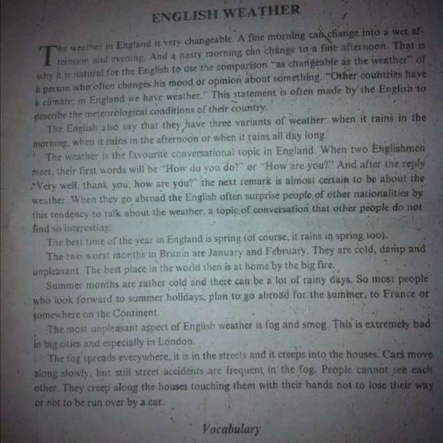 Погода в Англии очень переменчива. Ясное утро может перейти в дождливые день и вечер. А ненастное утро может превратиться в ясный день. Поэтому для англичан естественно использовать сравнение «переменчивый, как погода», говоря о человеке, который часто меняет свое мнение или настроение. «В других странах — климат; у нас в Англии — погода». Этим утверждением англичане часто описывают метеорологические условия своей страны.Англичане также говорят, что у них три варианта погоды: когда идет дождь утром, когда идет дождь днем и когда дождь идет целый день.Погода — любимая тема для разговора в Англии. Когда встречаются два англичанина, их первыми словами будут: «Как Ваши дела?» А после ответа «Спасибо, очень хорошо; а у Вас?» следующая фраза, вероятней всего, будет о погоде. Когда англичане едут за границу, они часто удивляют представителей других национальностей своей склонностью говорить о погоде, на тему, которую другие не считают интересной.Лучшим временем года в Англии является весна (конечно, весной тоже идет дождь). Двумя наихудшими месяцами в Британии считаются январь и февраль. Они холодные, сырые и неприятные. В этом случае самое лучшее место в мире — дома у камина.Летние месяцы довольно холодны, и летом может быть много дождливых дней. Поэтому большинство людей, которые с нетерпением вдут летнего отпуска, планируют на лето ехать за границу, но Францию или куда-нибудь на континент.Самое неприятное в погоде в Англии туман и смог.