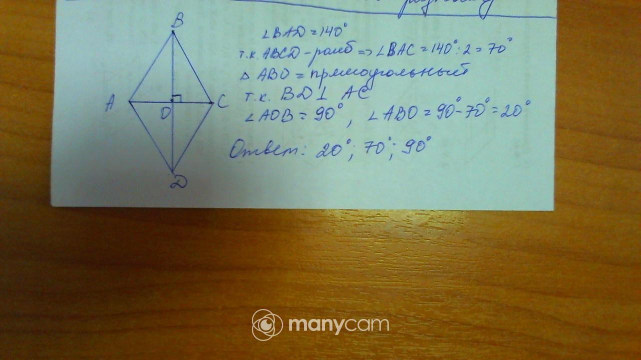 диагонали ромба АВСД пересекаются в точке О. найти все углы треугольника АВО, если угол ВАД=140°