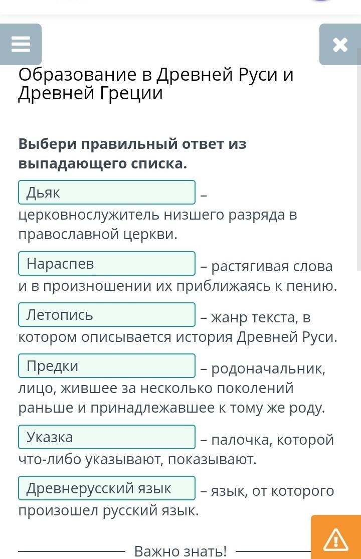 Образование в Древней Руси и Древней Греции Выбери правильный ответ из выпадающего списка. – церковнослужитель низшего разряда в православной церкви. – растягивая слова и в произношении их приближаясь к пению. – жанр текста, в котором описывается история Древней Руси. – родоначальник, лицо, жившее за несколько поколений раньше и принадлежавшее к тому же роду. – палочка, которой что-либо указывают, показывают. – язык, от которого произошел русский язык.