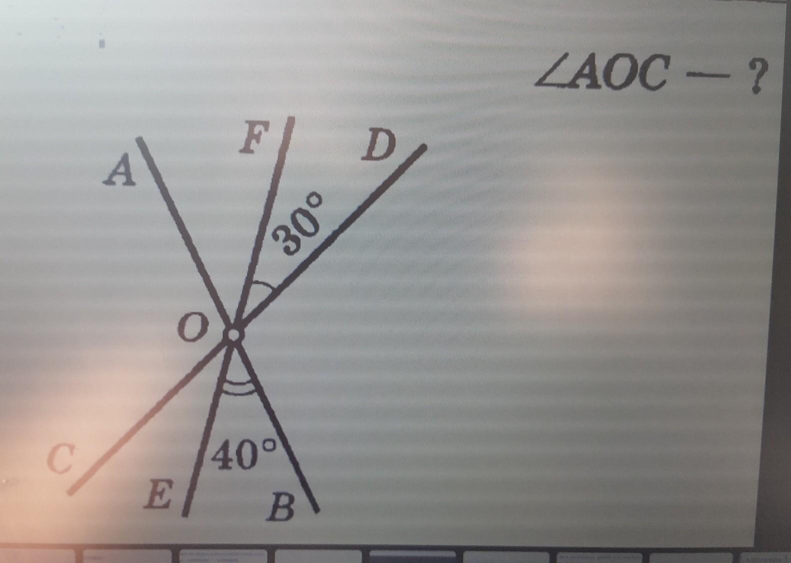 Угол ЕОВ и угол АОF - вертикальные, то есть угол АОF = 40 градусов. Угол FOD и угол СОЕ - вертикальные и угол СОЕ = 30 градусов. Прямая равна 180 градусов , значит угол АОС = 180 - (40+30) = 180 - 70 = 110 градусов
