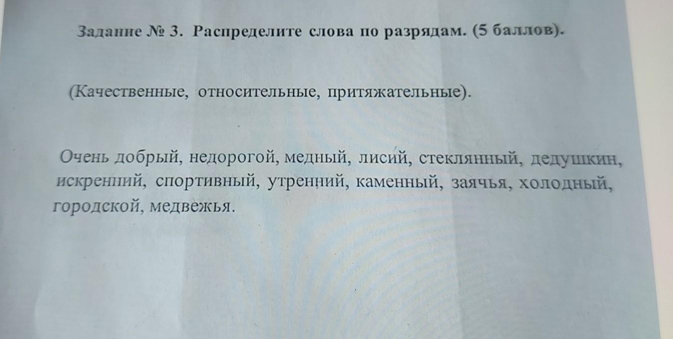 Задание № 3. Распределите слова по разрядам. (5 баллов). (Качественные, относительные, притяжательные). Очень добрый, недорогой, медный, лисий, стеклянный, дедушкин, искренний, спортивный, утренний, каменный, заячья, холодный, городской, медвежья.