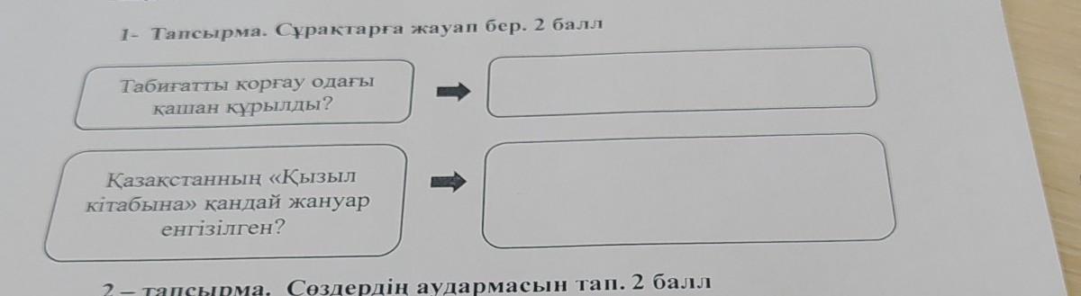 1- Тапсырма. Сұрақтарға жауап бер. 2 балл Табиғатты қорғау одағы қашан құрылды? Қазақстанның «Қызыл кітабына» қандай жануар енгізілген?