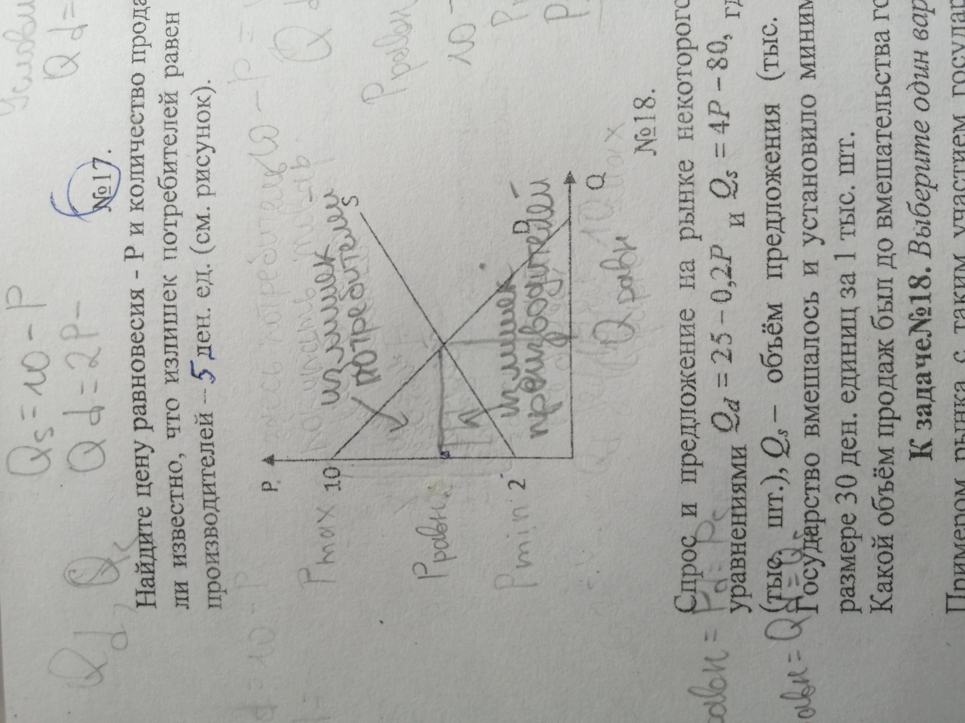Найдите цену равновесия-P и кол-во проданной продукции Q, если известно, что излишек потребителей равен 15 ден. ед., а излишек производителей-5ден. ед (см. рисунок)(только 17 задача)