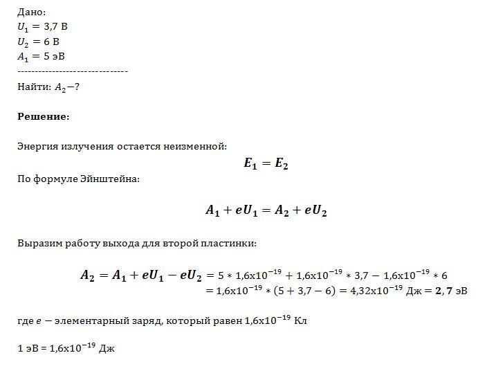При облучении ультрафиолетовыми лучами пластинки из никеля запирающее напряжение оказалось равным 3,7В. При замене из никеля пластинкой из другого металла напряжение потребовалось увеличить до 6 В. Определите работу выхода электрона с порехности этой пластинки. Работа выхода электронов их никеля равна 5эВ.
