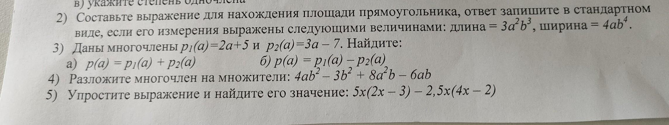 2) Составьте выражение для нахождения площади прямоугольника, ответ запишите в стандартном виде, если его измерения выражены следующими величинами: длина = 3а, ширина = 4ab".