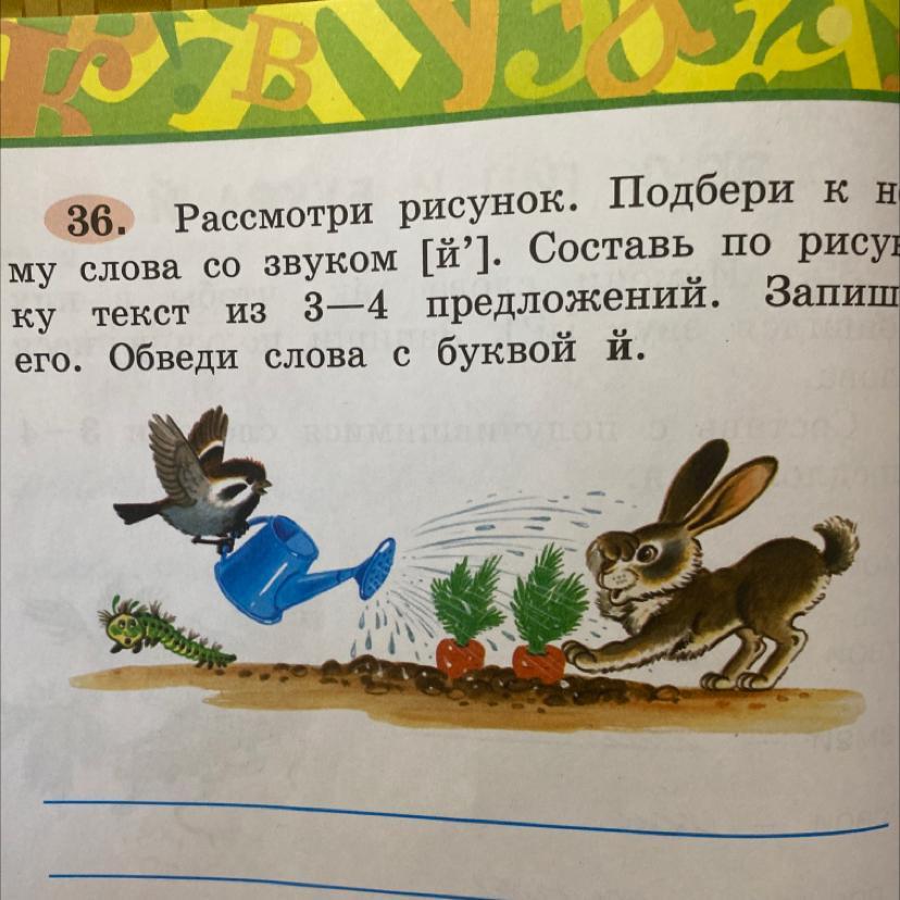Ответ: Воробей и зайчик посадили морковь. Зайка грядки пропалывает, а воробей из лейки поливает. “Лей воду, не жалей„- говорит другу зайчик. Скоро