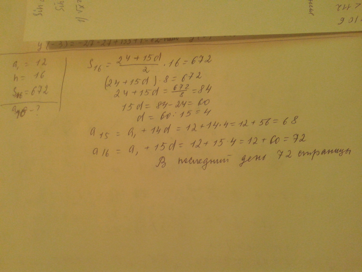 Ксюша решила прочесть книгу объёмом 672 страницы. Ежедневно она читает на одно и то же количество страниц больше по сравнению с предыдущим днём. Известно, что в первый день она прочла 12 страниц. Определите сколько страниц она прочла в последний день, если всего на чтение этой книги девочка потратила 16 дней.