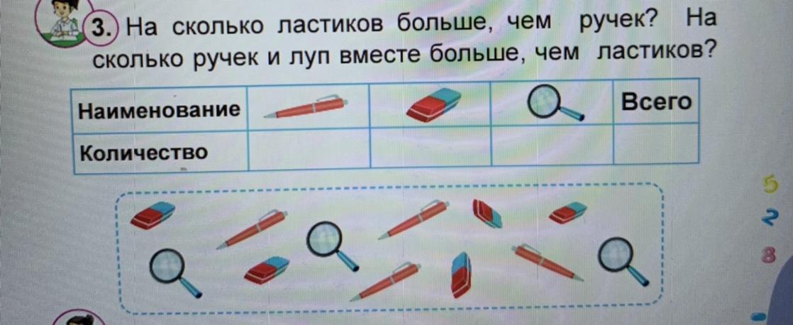 Ответ: 1)На 1 ластик больше чем ручек 2)на 2 ручек и луп больше чем ластиков.