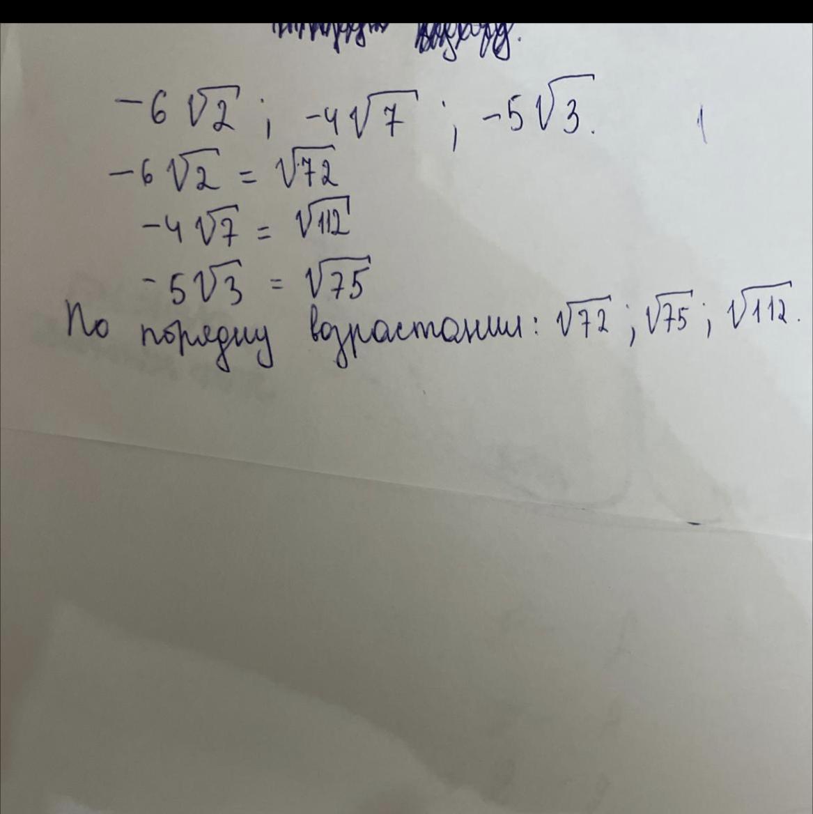 представьте числа в виде корень из а и расположите их в порядке возрастания: -6 умножить на корень из 2, -4 умножить на корень из 7, -5 умножить на короень из 3