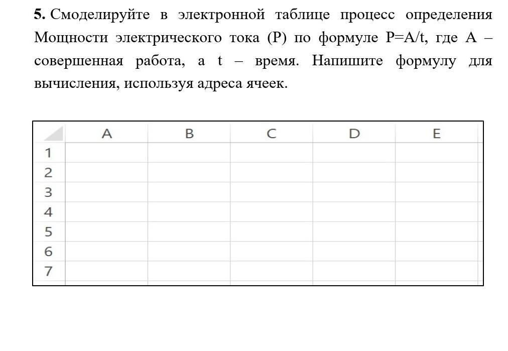 5. Смоделируйте в электронной таблице процесс определения Мощности электрического тока (Р) по формуле Р=А/t, где A – совершенная работа, а t – время. Напишите формулу для вычисления, используя адреса ячеек.