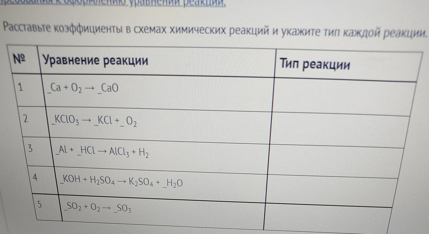 Расставьте коэффициенты в схемах химических реакций и укажите тип каждой реакции.