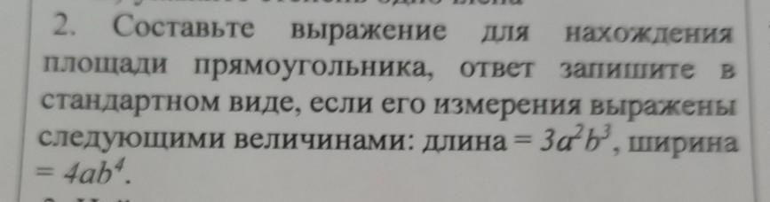 2. Составьте Выражение нахождения площади прямоугольника, ответ запишите в стандартном виде, если его измерения выражены следующими величинами: длина = 3а2b3 ширина = 4ab4.