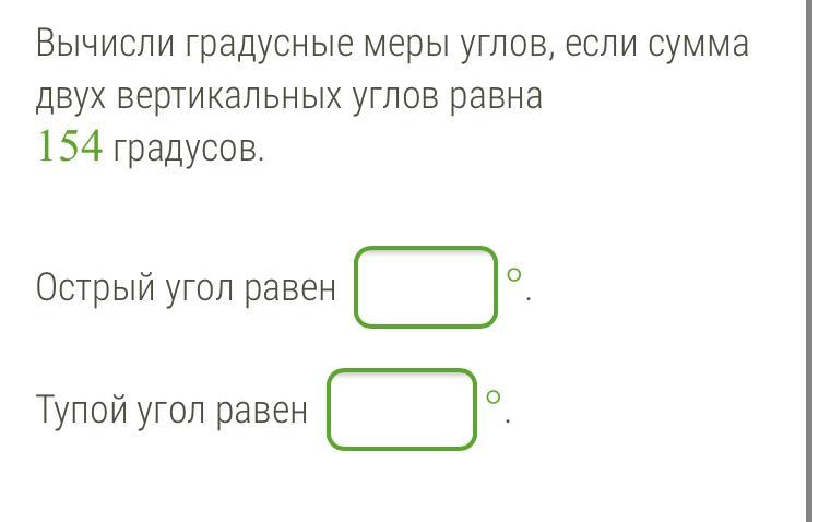 Вычисли градусные меры углов, если сумма двух вертикальных углов равна 154 градусов. СРОЧНО ДАМ 20 БАЛЛОВ!!!