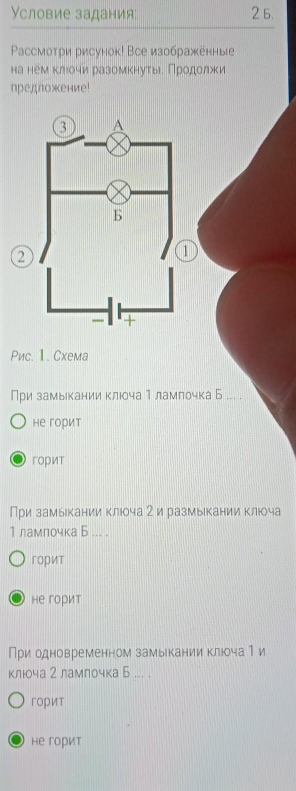 Рассмотри рисунок все изображенные на нём ключи разомкнуты Продолжи предложение при замыкании ключа 1 лампочка B не горит горит А при замыкании ключа 2 и размыкании ключа 1 лампочка B горит Не горит при одновременном замыкании ключа 1 и ключа 2 лампочка B горит Не горит