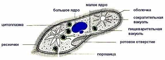 Инфузория-туфелька имеет размер около 0,1-0,3мм. Форма тела напоминает туфельку, потому она получила такое название. Это животное имеет постоянную форму тела, так как эктоплазма снаружи уплотнена и образует пелликулу. Тело инфузорий покрыто ресничками. Их насчитывается около 10-15 тыс. Характерной чертой строения инфузорий является наличие двух ядер: большого (макронуклеус) и малого (микронуклеус). С малым ядром связана передача наследственной информации, а с большим — регуляция жизненных функций. Инфузория-туфелька передвигается с помощью ресничек, передним (тупым) концом вперед и одновременно вращается вправо вдоль оси своего тела. Большая скорость движения инфузории зависит от веслообразного движения ресничек.