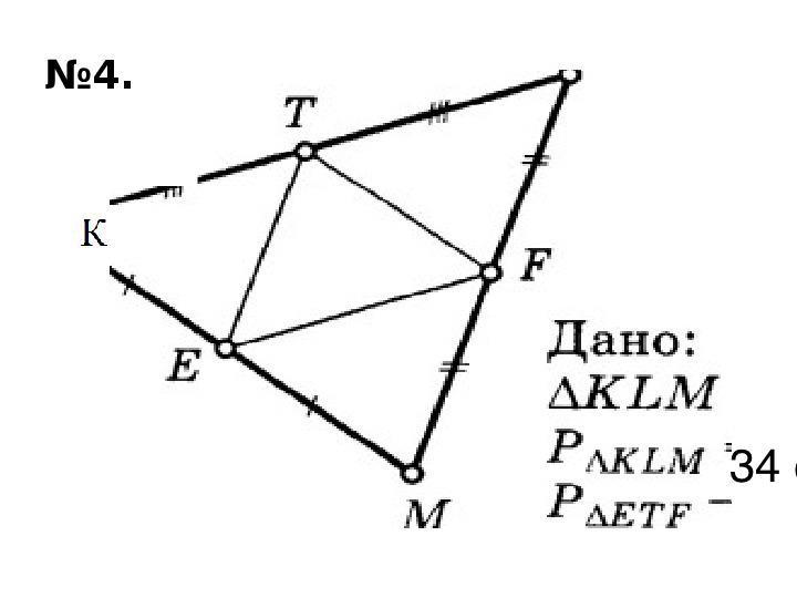 По условию PΔMLK=34. Также он равен: P=ML+MK+KM = MF+FL+ME+EK+KT+TL=2MF+2ME+2KT=2•(MF+ME+KT)=34. Отсюда MF+ME+KT=17.