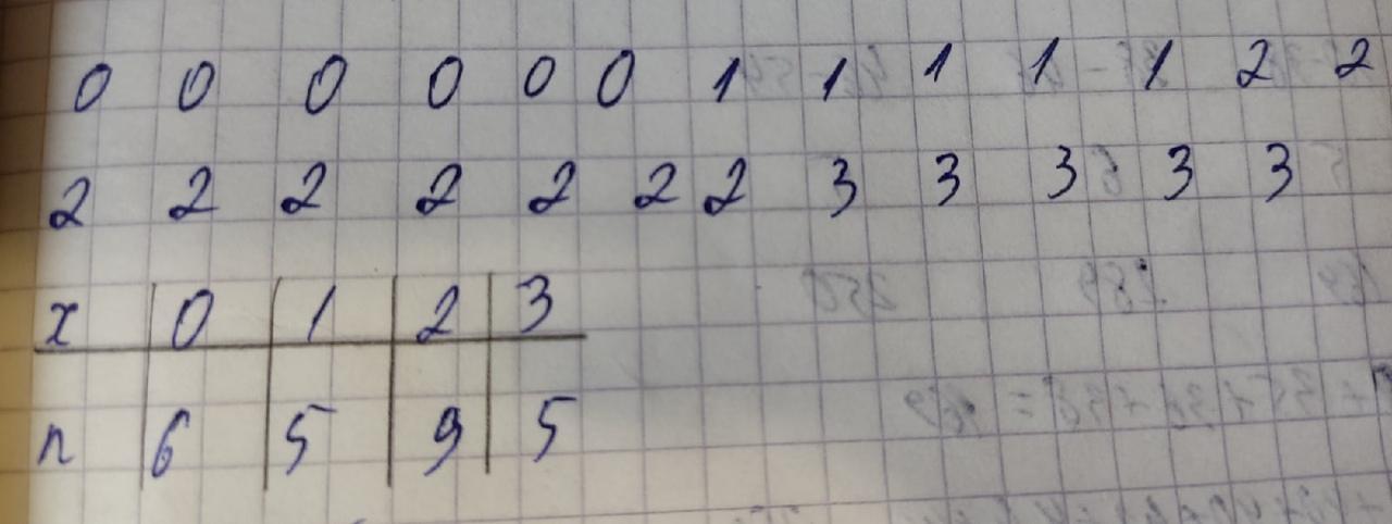 20 баллов - Имеются данные о категориях учителей школы. Постройте дискретный вариационный ряд распределения учителей по категориям (0-педагог-модератор, 2-педагог-эксперт, 1- педагог-исследователь, 3 -педагог-мастер) : 2,3,2,0,1,0,1,2,3,0,2,3,2, 1,0,0,3,2,3, 0,1,2,2,1,2 Помогите пожалуйста!)