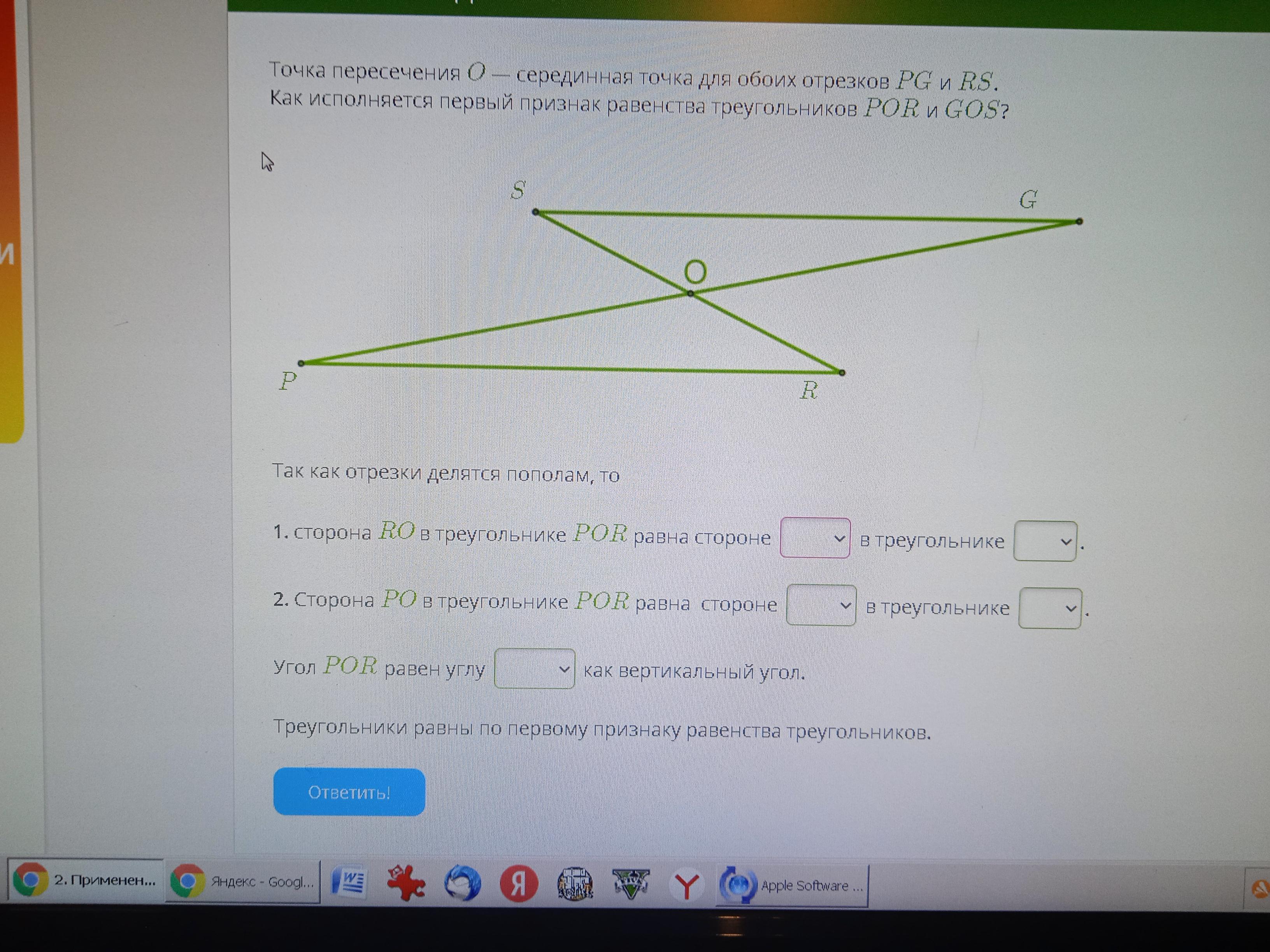 1 сторона RO в треугольнике POR равна стороне SO в треугольнике GOS.