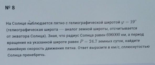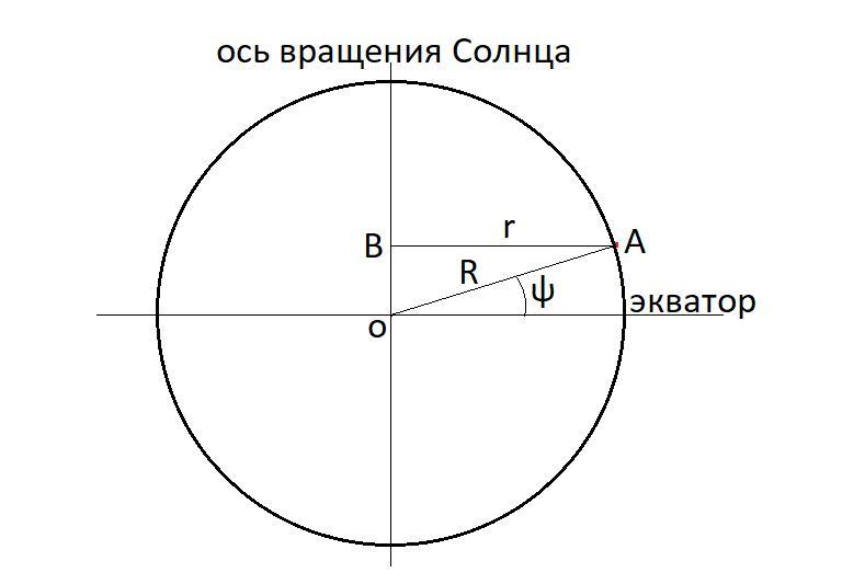 Объяснение: Вначале необходимо найти длину пути, который пройдет солнечное пятно за один оборот Солнца. Смотрите рисунок. Длина пути S = 2πr. Радиус r = cosψ* R, здесь R = радиус Солнца. Тогда r = 0,9455 * 696000 = 658080 км. Длина пути пятна S = 2π * 658080 = 4134838,59 км. Путь такой длины пятно пройдет за 24,7 суток. Это время в секундах T = 24,7 * 24 * 60 * 60 = 2134080 с. Линейная скорость движения пятна V = S/T = 4134838,59/2134080 ≈ 1,938 км/с