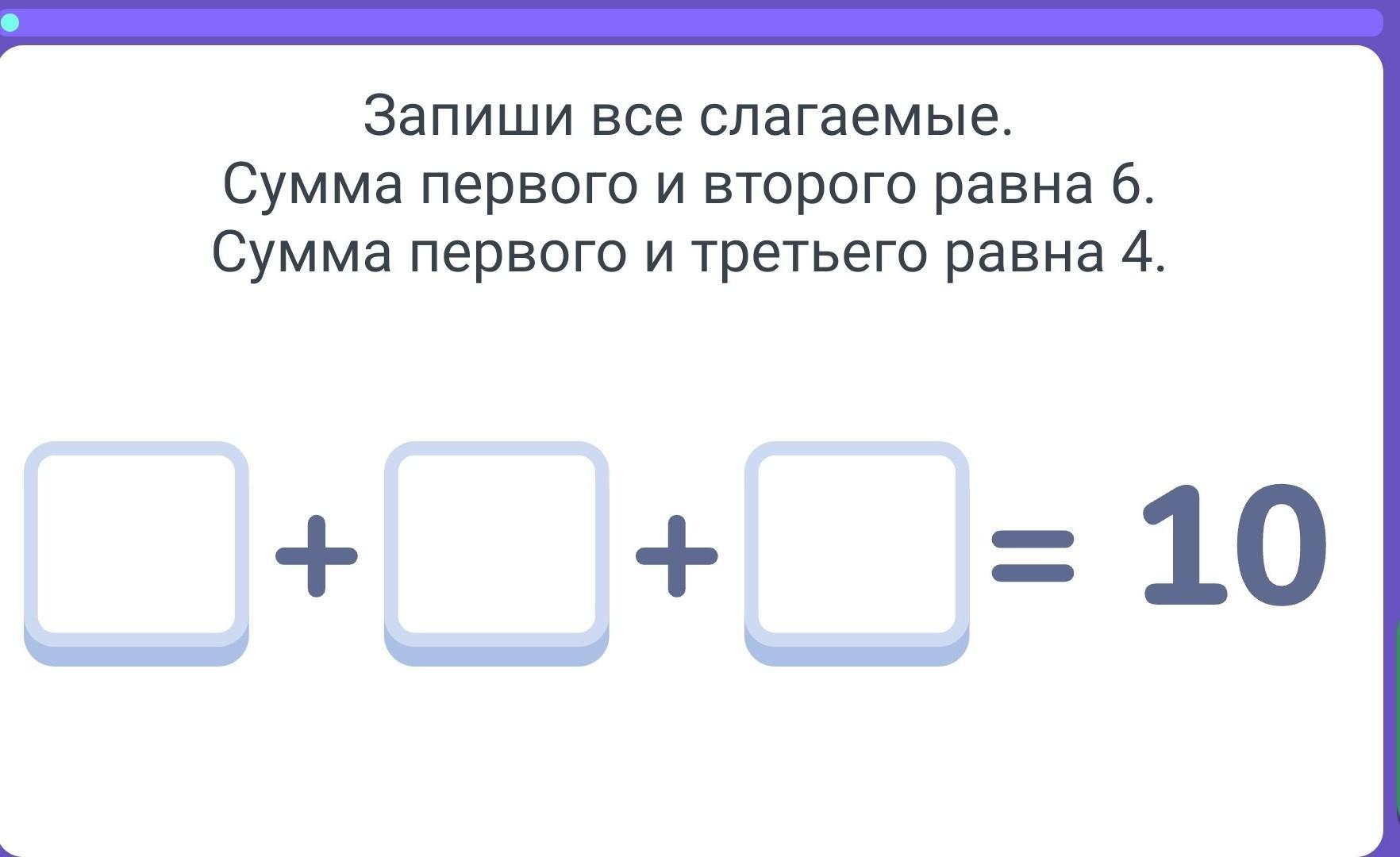 Пусть первое число будет х, тогда второе у, а третье z. Сумма х и у равна шести, сумма х и z равна 4, сумма x, y и z равна десяти. Составим систему: