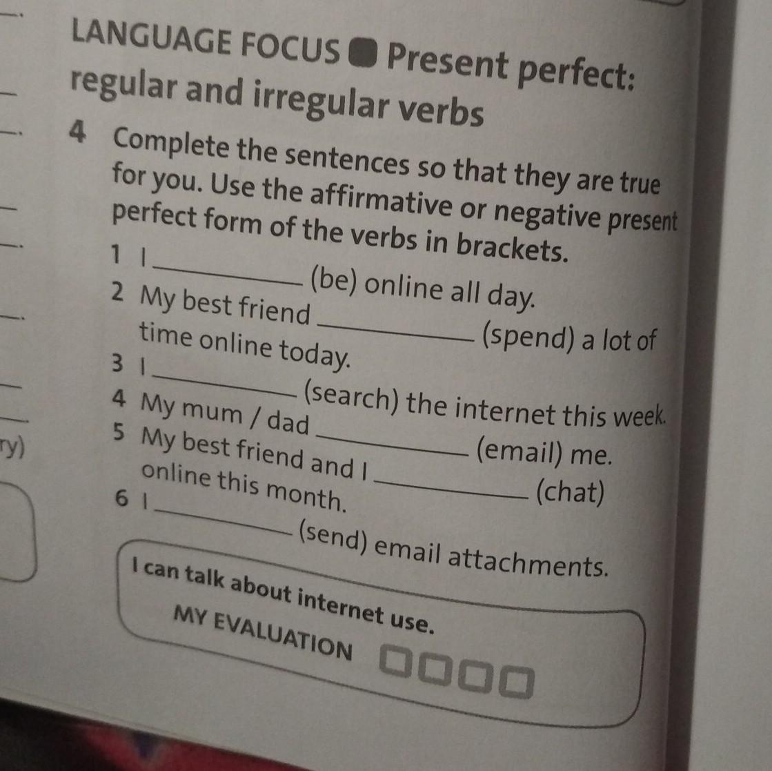 4 Complete the sentences so that they are true for you. Use the affirmative or negative present perfect form of the verbs in brackets. 11 (be) online all day 2 My best friend (spend) a lot of time online today. 31 (search) the internet this week. 4 My mum / dad (email) me. 5 My best friend and I (chat) online this month. 61 (send) email attachments.