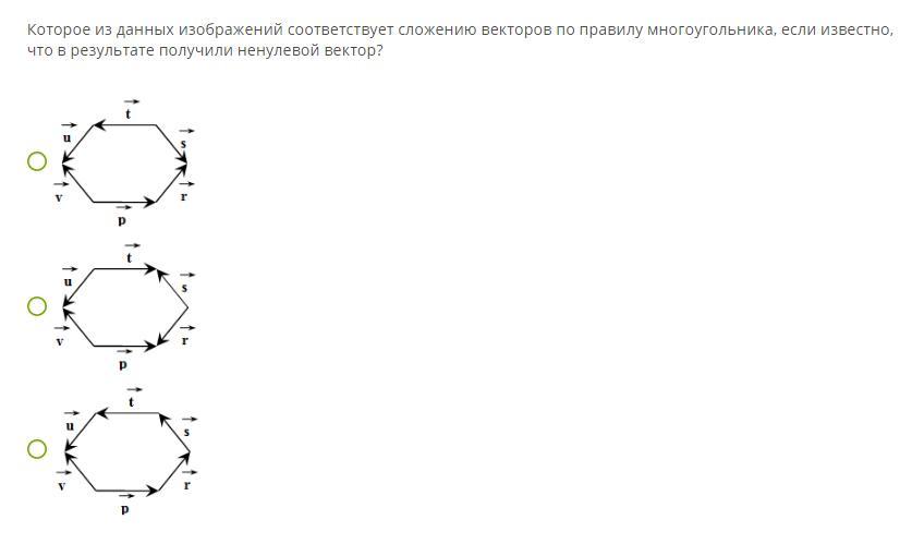 Которое из данных изображений соответствует сложению векторов по правилу многоугольника, если известно, что в результате получили ненулевой вектор?