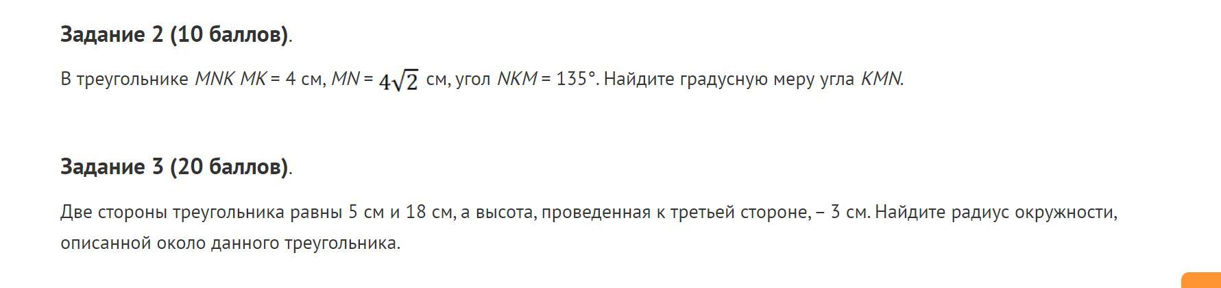 В треугольнике MNK MK = 4 см, MN = 4 koren iz 2.png см, угол NKM = 135°. Найдите градусную меру угла KMN.