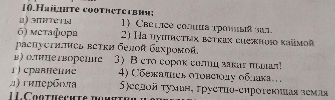 10.Найдите соответствия: а) эпитеты 1) Светлее солнца тронный зал. б) метафора 2) На пушистых ветках снежною каймой распустились ветки белой бахромой. в) олицетворение 3) В сто сорок солнц закат пылал! г) сравнение 4) Сбежались отовсюду облака... д) гипербола 5 седой туман, грустно-сиротеющая земля