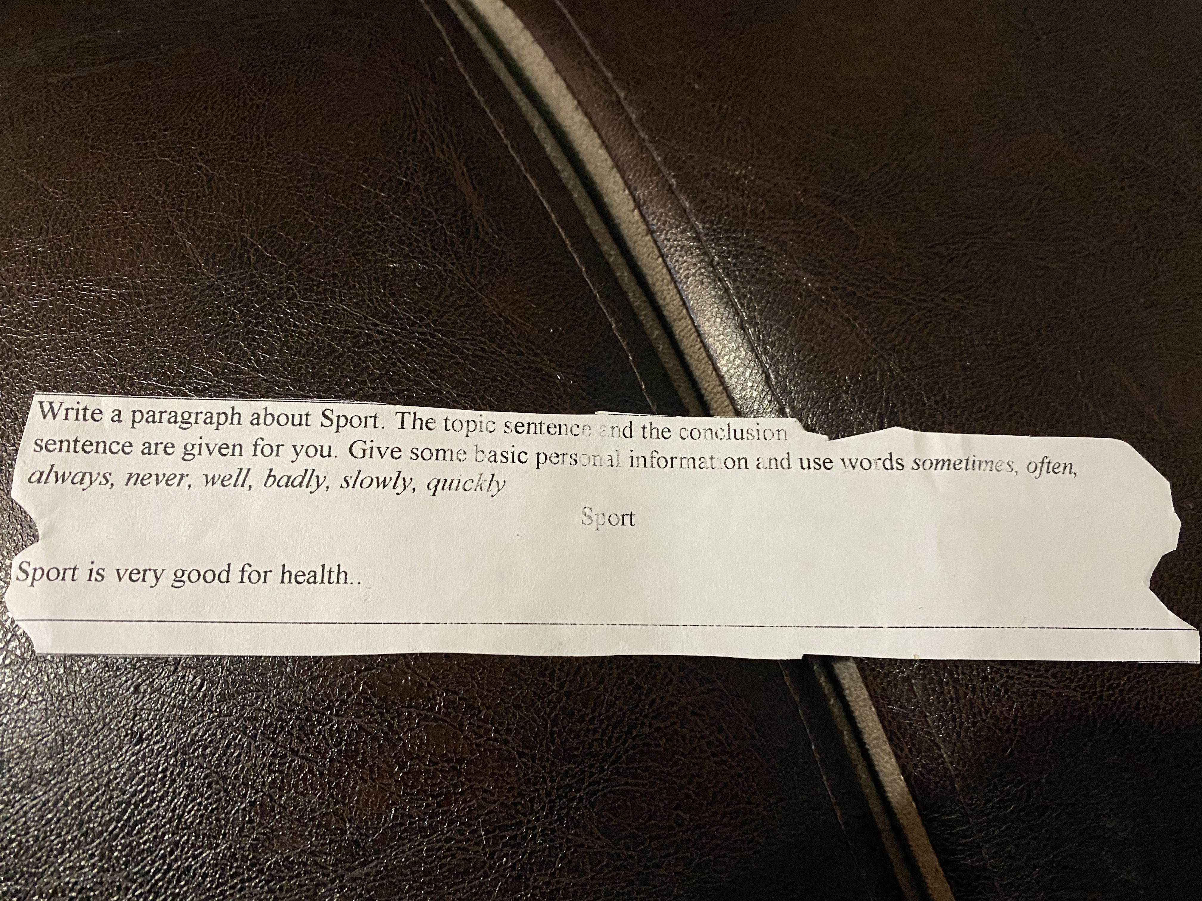 Перевод: Напишите параграф о спорте. Тема приговора заключительного предложения дана для вас. Дайте некоторую базовую личную информацию и используйте слова иногда, часто, всегда, никогда, ну, плохо, медленно, быстро.