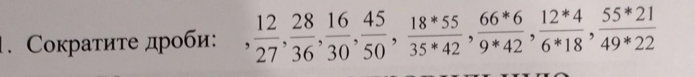 1. Сократите дроби: 12 28 16 45 18* 55 66*6 12*4 55*21 27'36'30'50' 35 * 42 '9*42 '6*18'49*22
