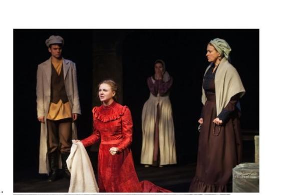 Персонажи: Непосредственно сама Катерина в красном платье, справа-Кабаниха, слева-Тихон, сзади-Варвара